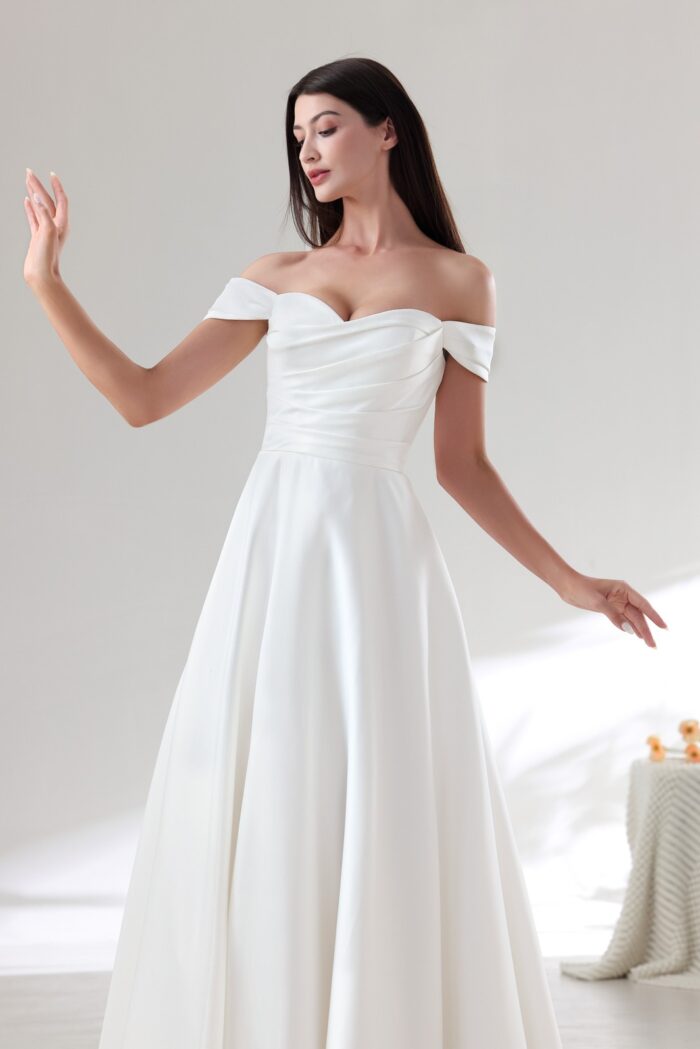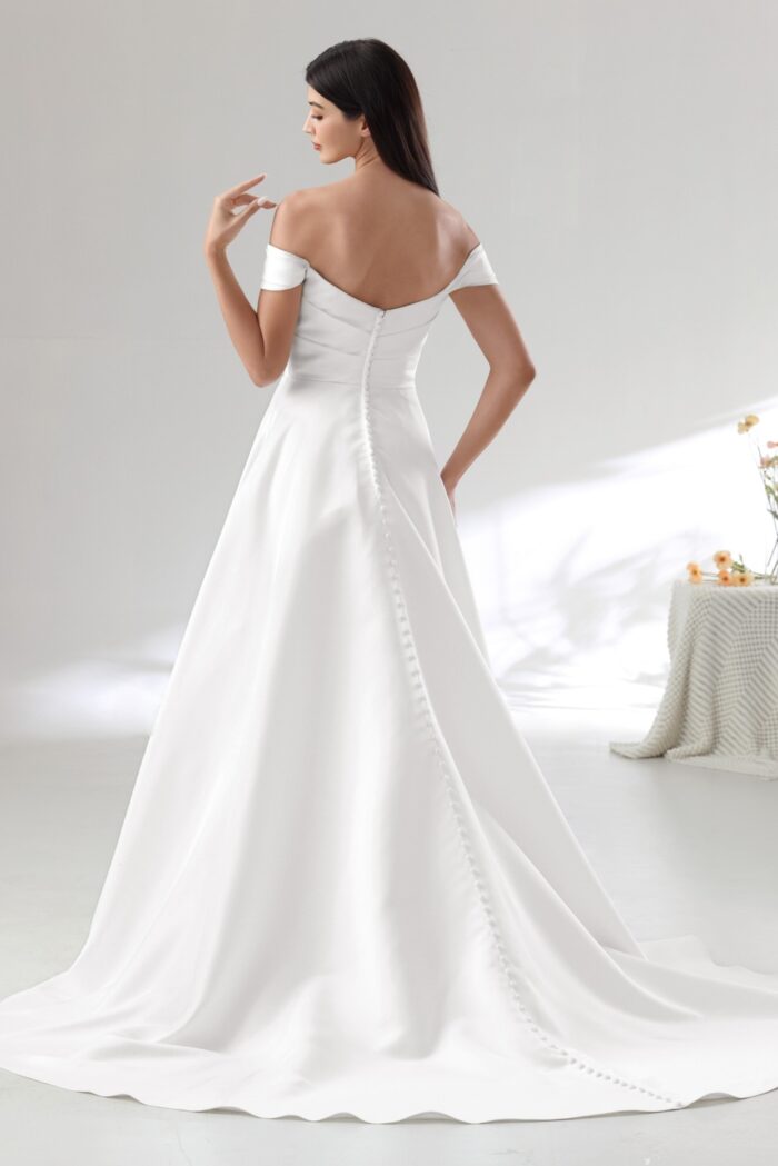 SIMPLE OFF-THE-SHOULDER SATIN WEDDING DRESS WITH ASYMMETRICAL RUCHING