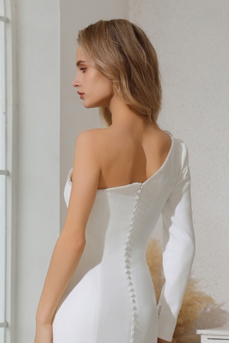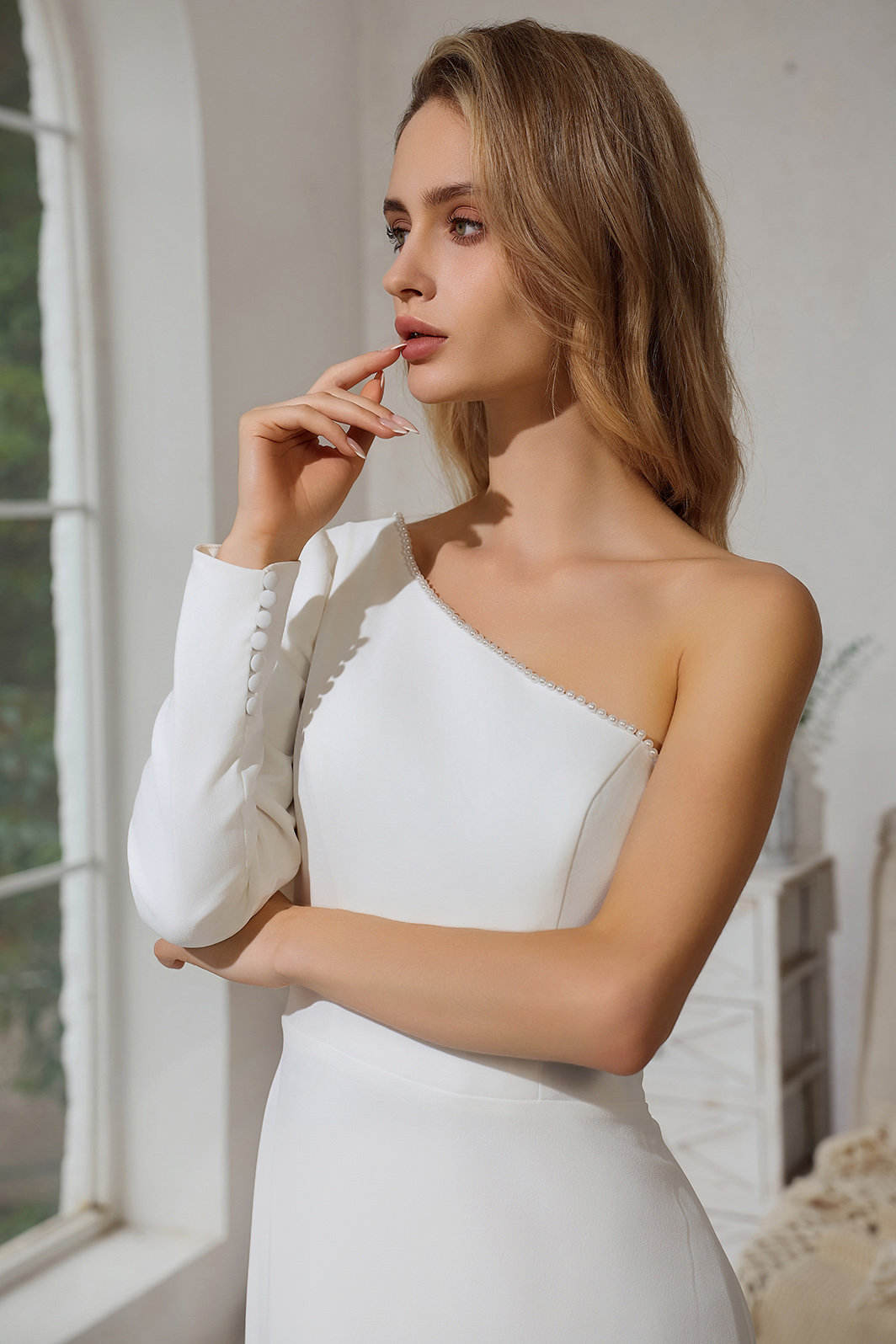 ONE-SHOULDER BRIDAL GOWN WITH PEARL NECK AND LONG SLEEVE