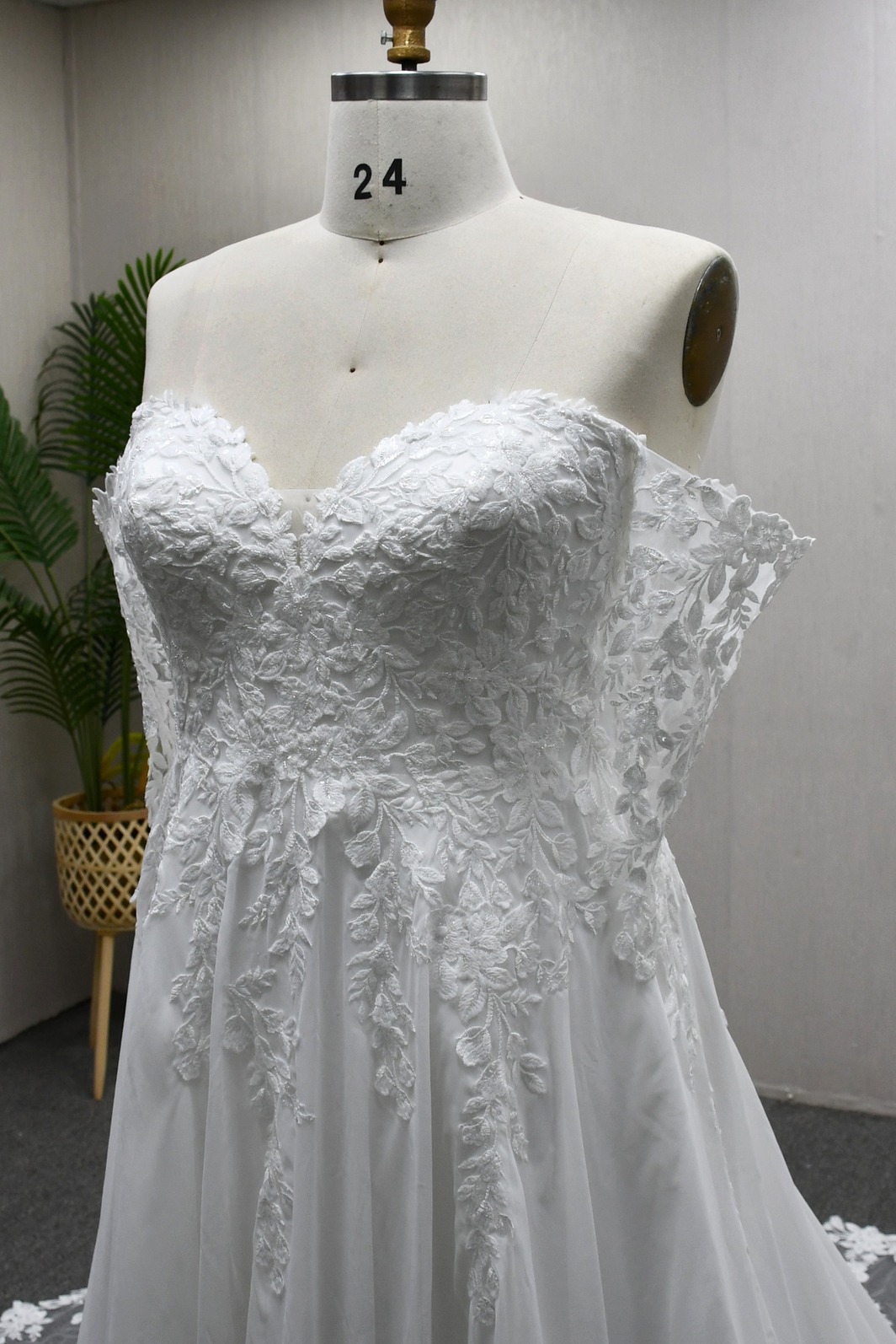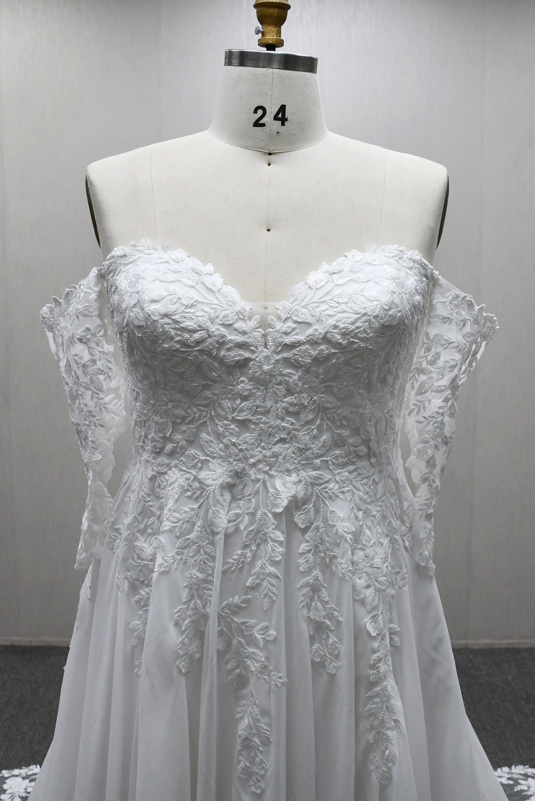 A-LINE WEDDING GOWN WITH OFF-THE-SHOULDER LONG SLEEVES AND SCALLOPED TRAIN