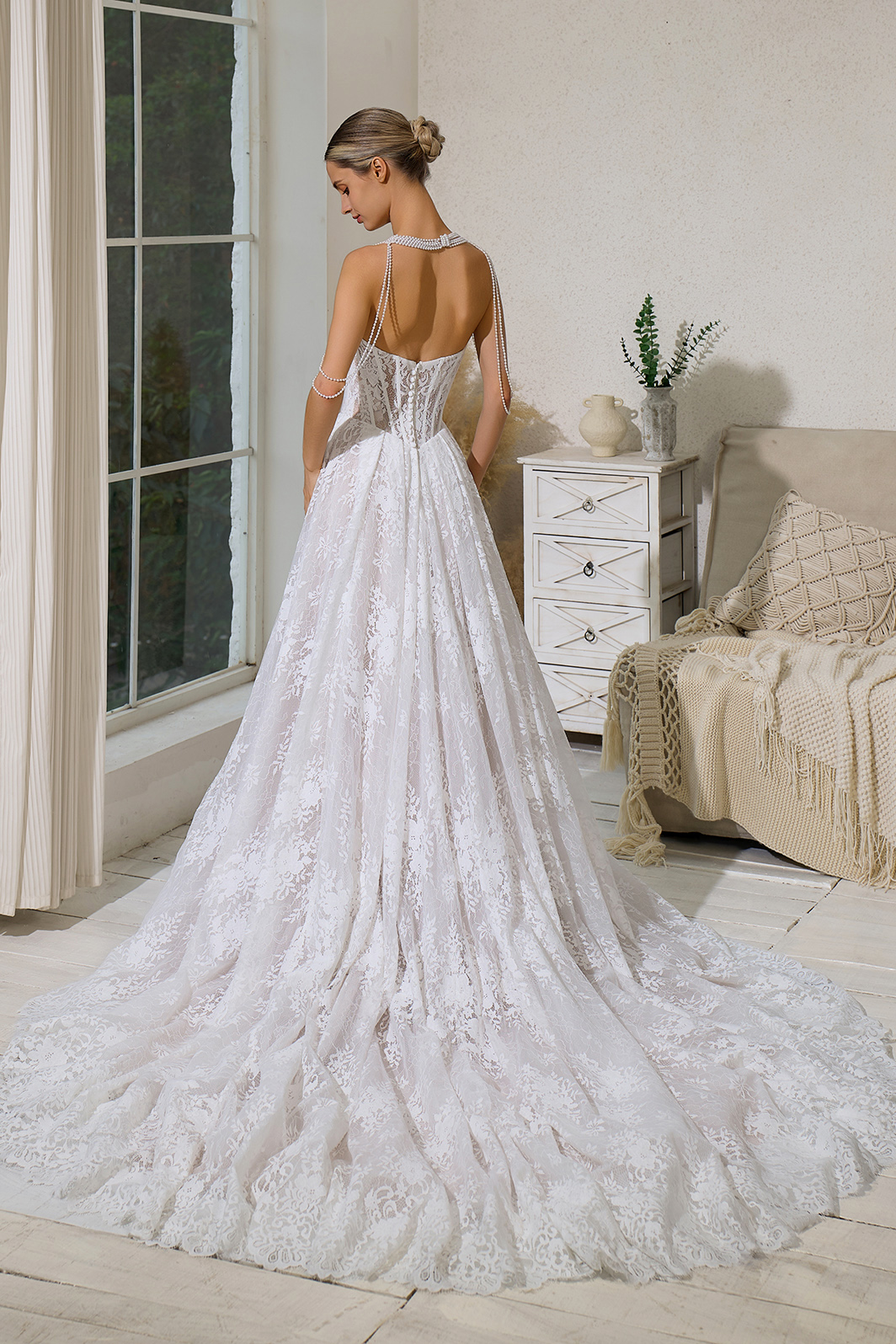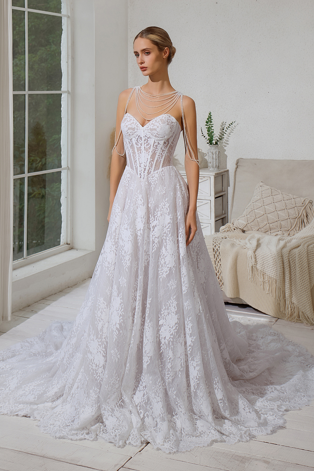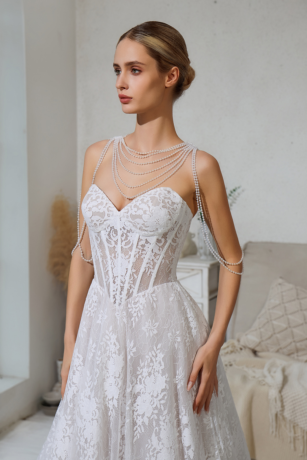 CORSET LACE WEDDING DRESS WITH PEARL NECKLACE