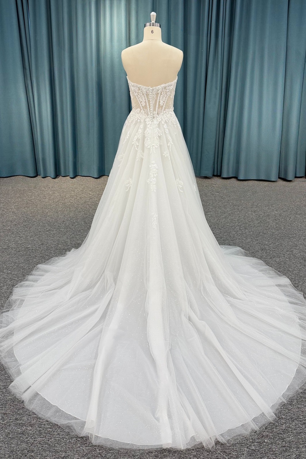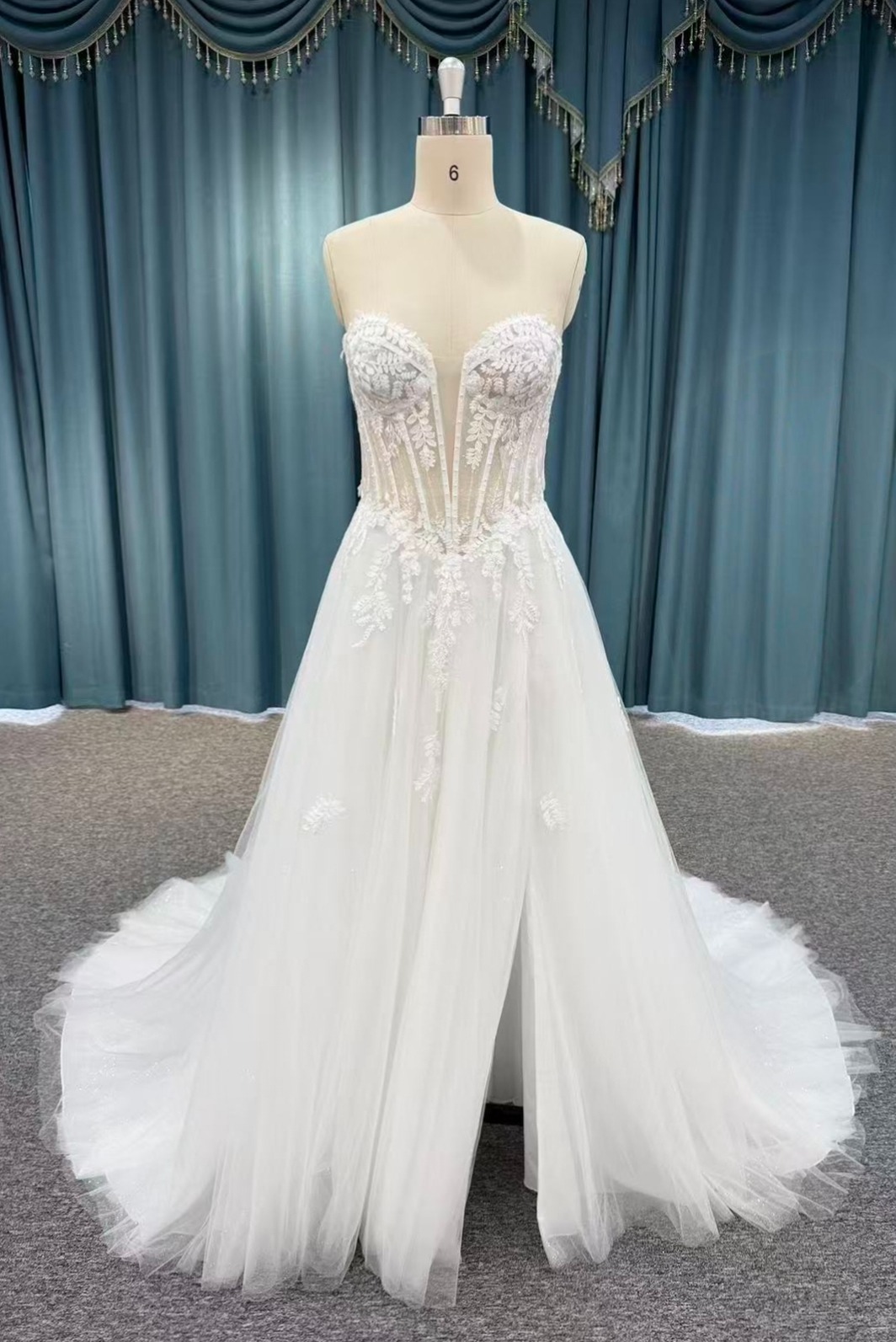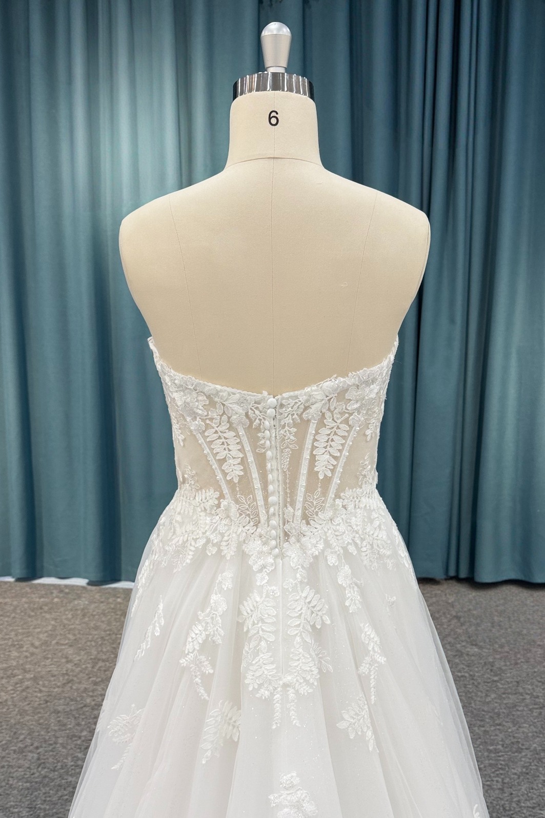 A-LINE LACE WEDDING GOWN WITH CORSET BODICE AND SLIT