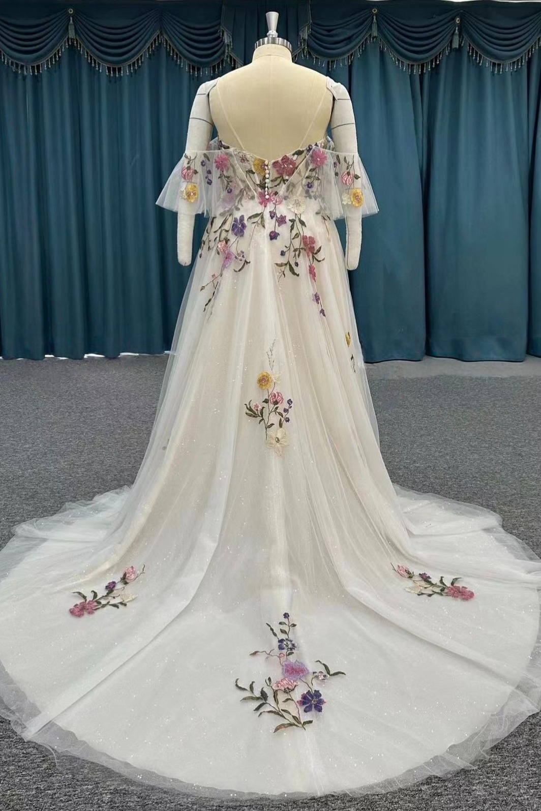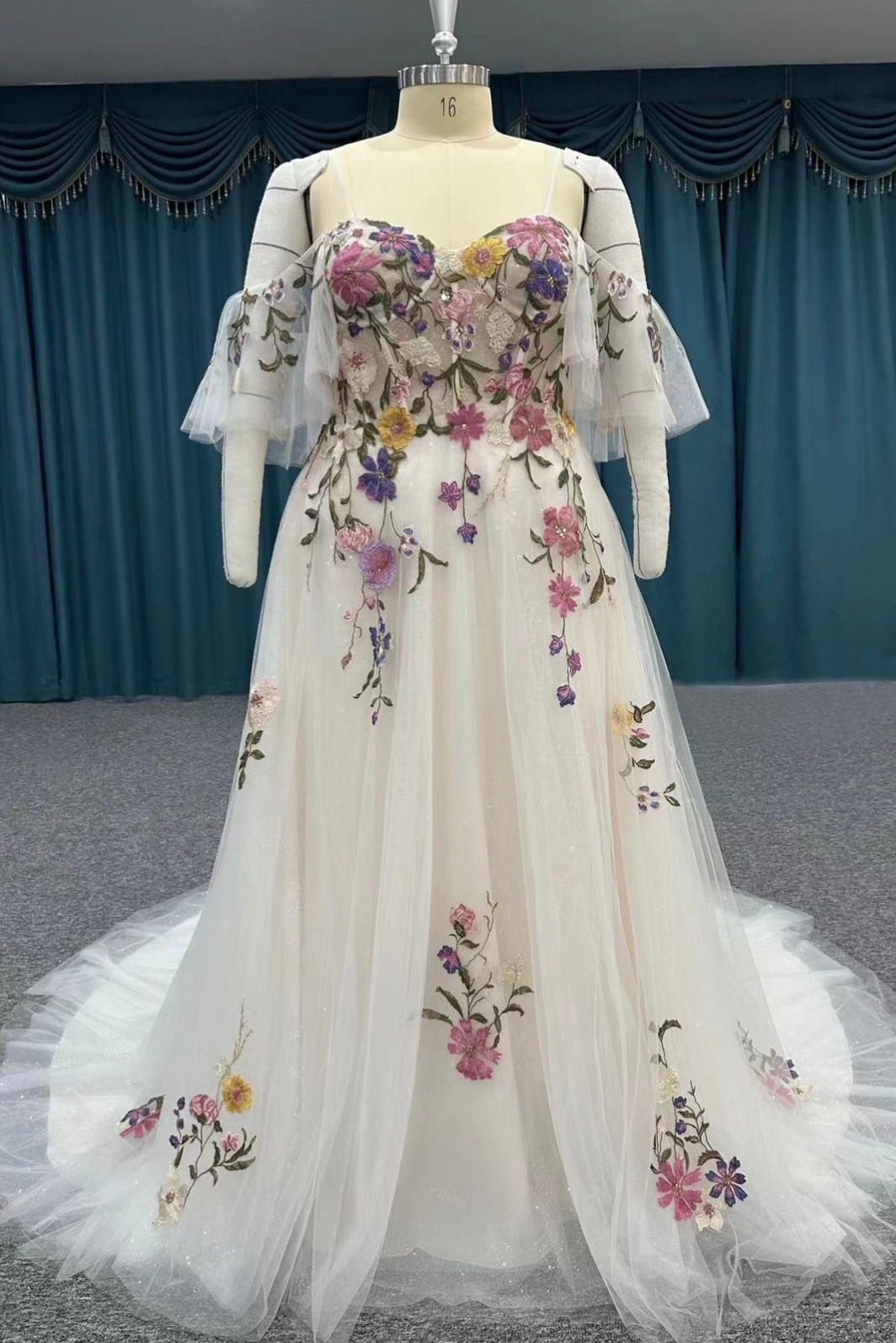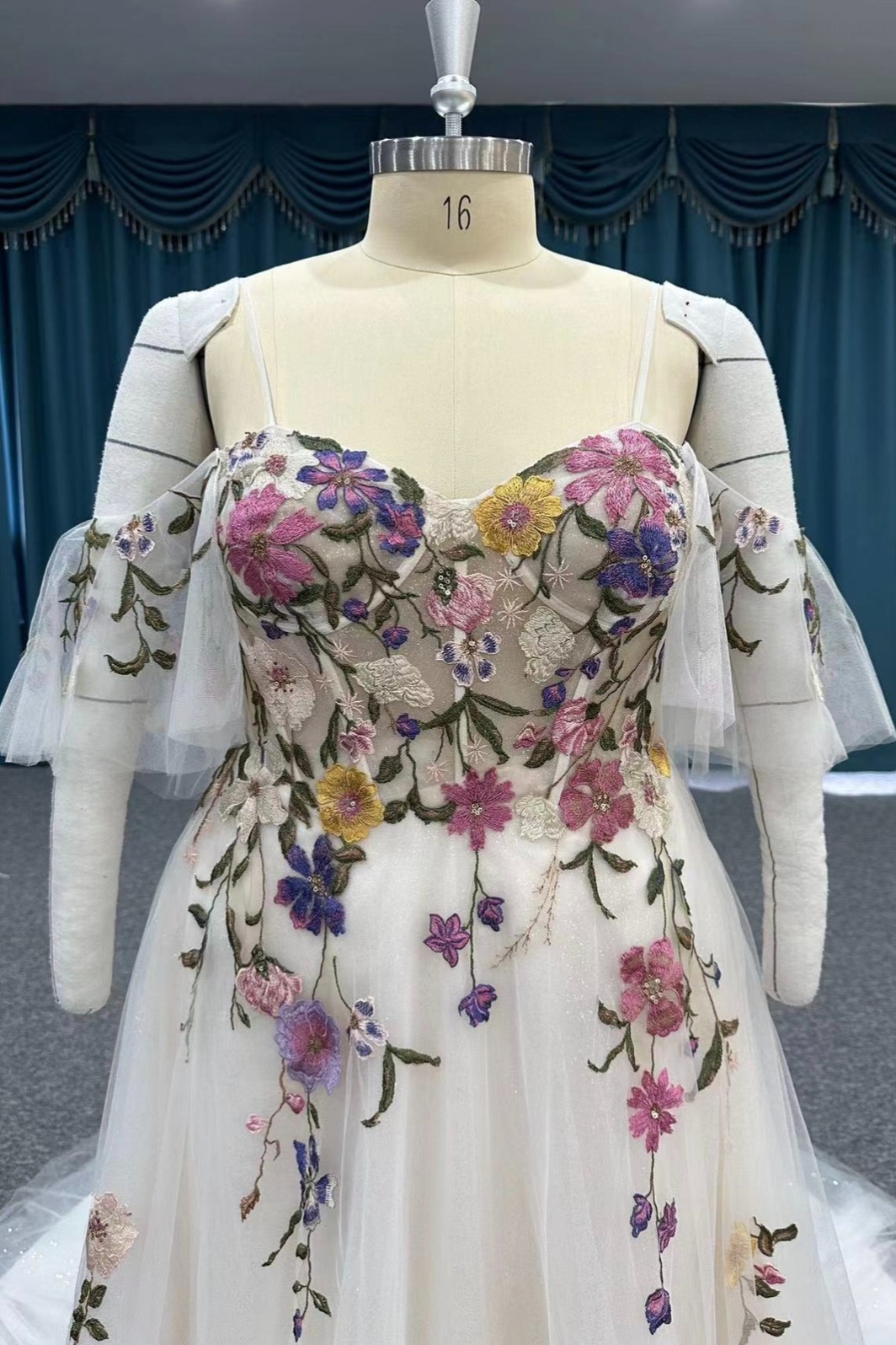 COLORFUL FLORAL OFF-THE-SHOULDER GLITTER TULLE WEDDING DRESS