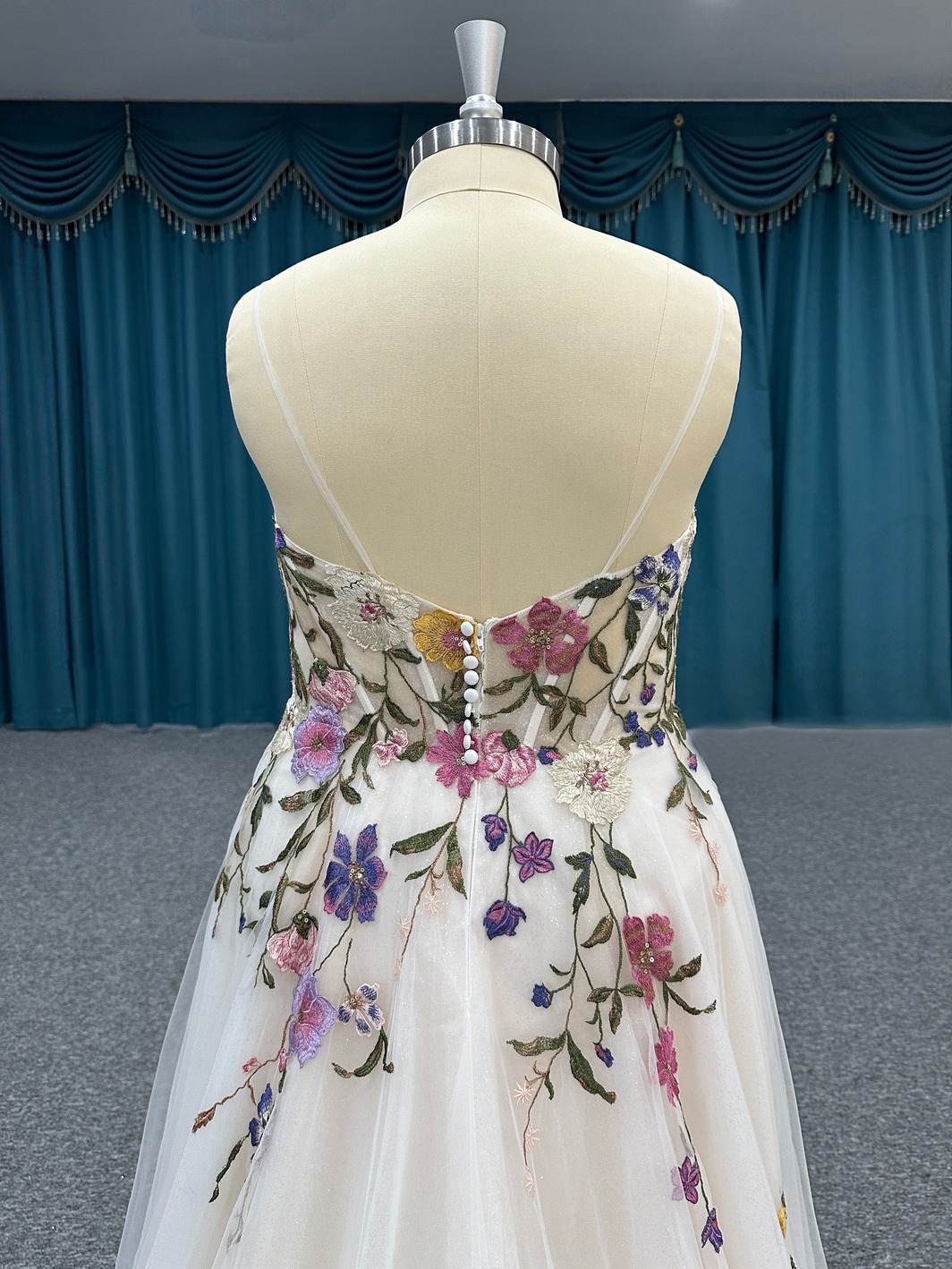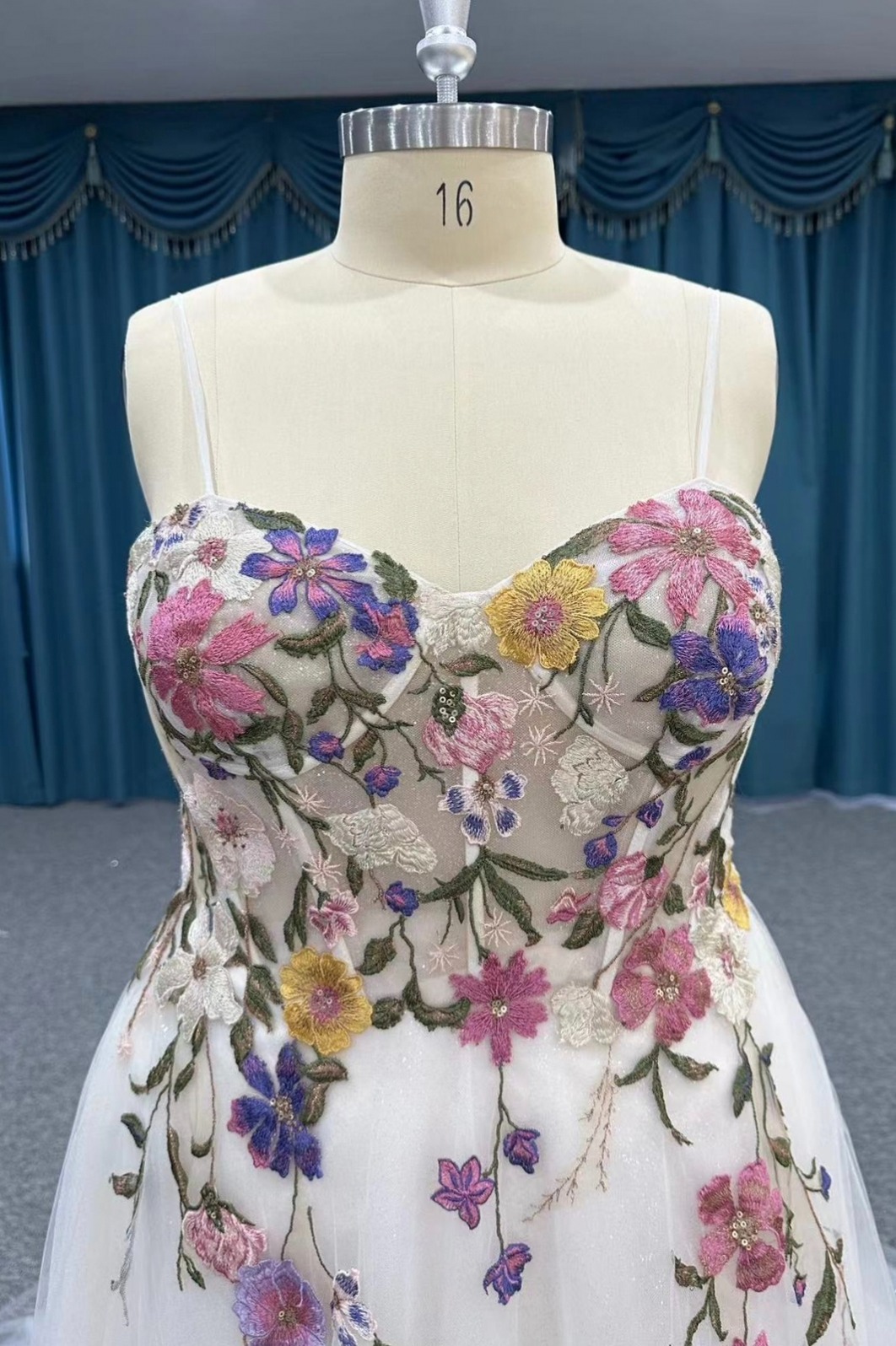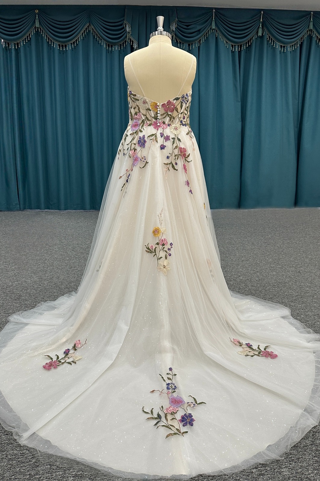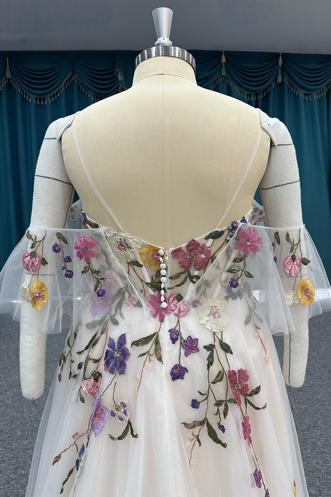 COLORFUL FLORAL OFF-THE-SHOULDER GLITTER TULLE WEDDING DRESS
